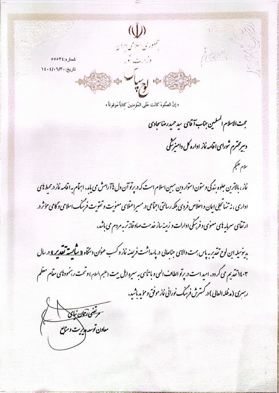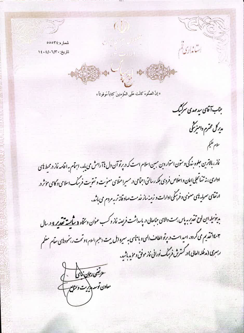 وی گفت : در این نشست ضمن ارائه ی راه کارهایی برای تشویق همکاران به شرکت حداکثری در نماز جماعت و بررسی نقاط آسیب پذیر در این زمینه ، از دستگاه های اجرایی از جمله دامپزشکی استان قم که در سال ۱۴۰۳ امتیاز لازم را در سامانه سجاده کسب نموده بودند ، تقدیر به عمل آمد .
