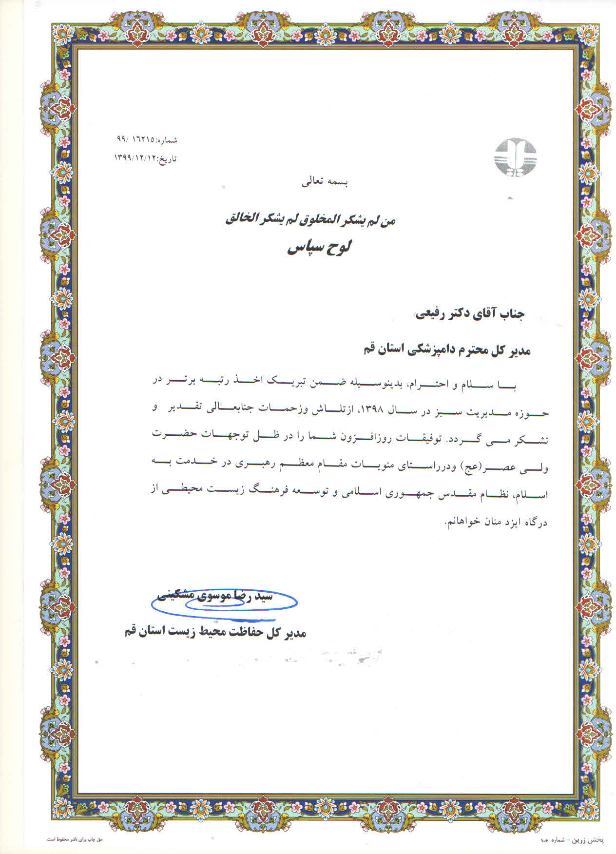 اداره کل دامپزشکی استان قم موفق به اخذ رتبه برتر در حوزه مدیریت سبز شد